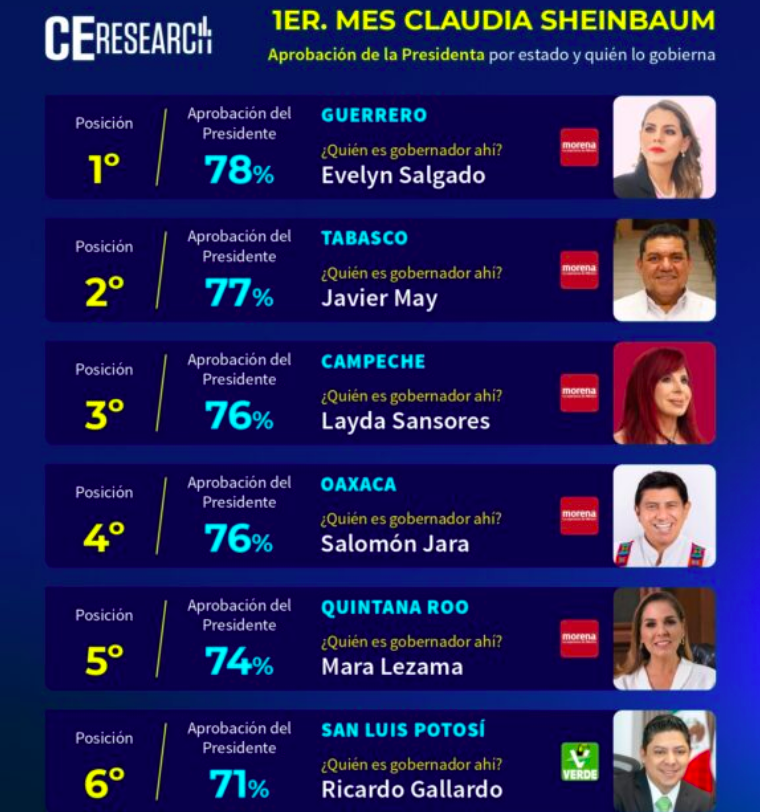 EN SU PRIMER MES DE GOBIERNO, CLAUDIA SHEINBAUM TIENE UN 65.3% DE APROBACIÓN; GALLARDO OCUPA EL 6TO. LUGAR CON 71%