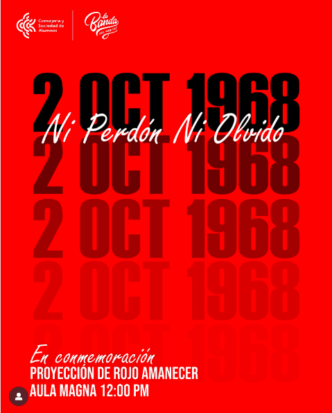 La Consejería, Sociedad de Alumnos y la Facultad del Hábitat de la UASLP, convocan, en conmemoración al 2 de octubre, a observar la proyección de la película "Rojo Amanecer" hoy jueves en la aula magna de la institución en punto de las 12:00 pm.