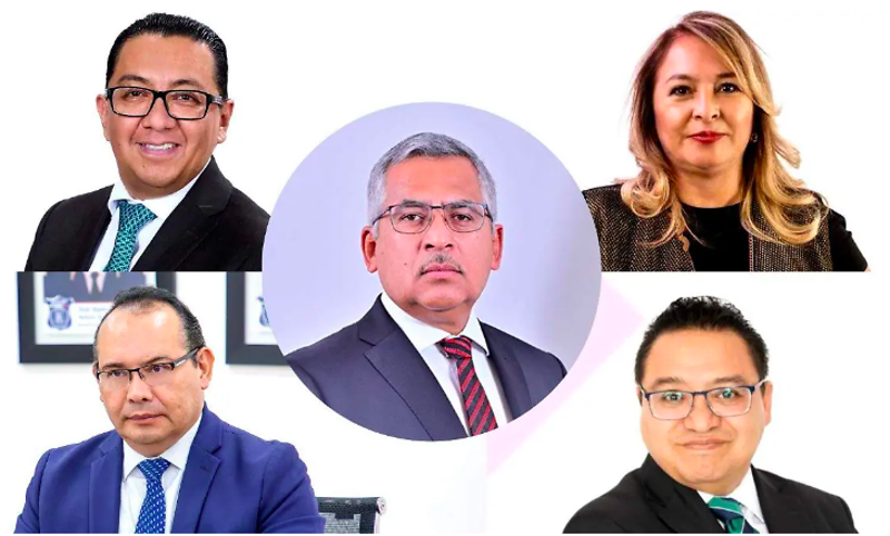 Los abogados Ángel Gonzalo Santiago Hernández, José Luis Ruiz Contreras, Mónica Kemp Zamudio, Arturo Morales Silva y Juan David Ramos Ruiz, quienes pasarán a integrar el Supremo Tribunal de Justicia del Estado de San Luis Potosí.