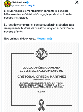 "El Club América lamenta profundamente el sensible fallecimiento de Cristóbal Ortega, leyenda absoluta de nuestra institución. Su legado y amor por el equipo quedarán grabados para siempre en la historia de nuestro club y en el corazón de nuestra afición. Nos unimos al dolor que embarga a sus familiares y amigos en este difícil momento", expresó el cuadro capitalino en redes sociales.