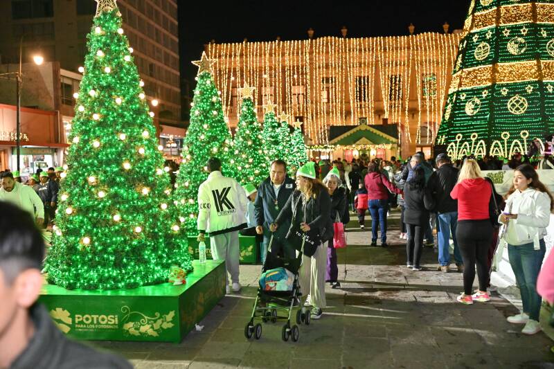 En la plaza de Los Fundadores durante un mes las y los potosinos y visitantes vivirán momentos de alegría y disfrutarán de la pista de hielo adornada con más de 20 pinos navideños que complementan al monumental árbol de 33 metros de altura y que hacen de este emblemático sitio del Centro Histórico ideal para las selfies y fotografías.