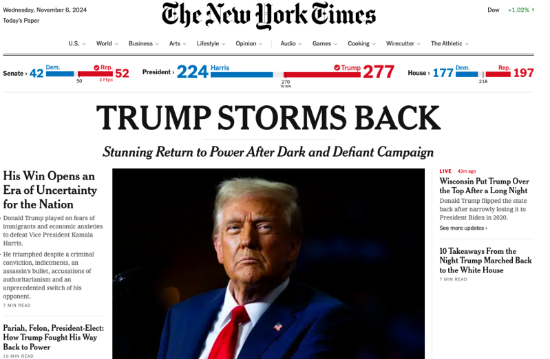Las portadas de los principales medios de todo el mundo como el New York Times dan a conocer la hazaña del republicano con un titular que a 8 columnas dice: "Furioso regreso de Trump. Impresionante retorno al poder después de una campaña oscura y desafiante".