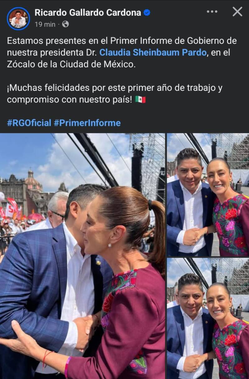 Tras salir de Palacio Nacional y rendir honores a la escolta conformada por mujeres, tardó 10 minutos en llegar hasta el templete, en un camino donde saludó y se tomó fotos con los asistentes, quienes provenían de distintas partes del país, entre ellos el gobernador Ricardo Gallardo Cardona que presumió el saludo en sus redes sociales.