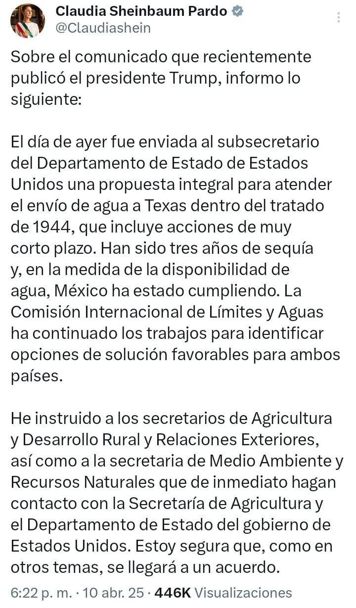 “El día de ayer 10 de abril, fue enviada al subsecretario del Departamento de Estado de Estados Unidos una propuesta integral para atender el envío de agua a Texas dentro del tratado de 1944, que incluye acciones de muy corto plazo. Han sido tres años de sequía y, en la medida de la disponibilidad de agua, México ha estado cumpliendo. La Comisión Internacional de Límites y Aguas ha continuado los trabajos para identificar opciones de solución favorables para ambos países”, precisó en X.