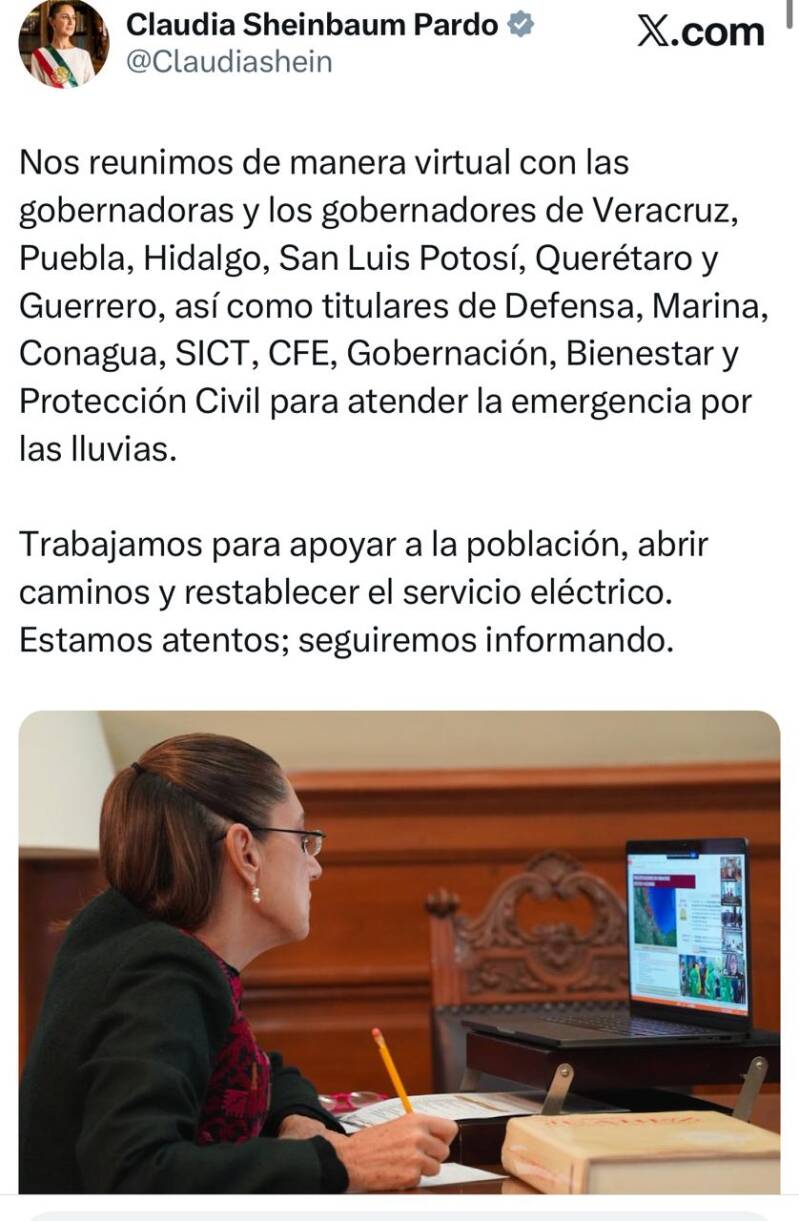 "Nos reunimos de manera virtual con las gobernadoras y los gobernadores de Veracruz, Puebla, Hidalgo, San Luis Potosí, Querétaro y Guerrero, así como titulares de Defensa, Marina, Conagua, SICT, CFE, Gobernación, Bienestar y Protección Civil para atender la emergencia por las lluvias. Trabajamos para apoyar a la población, abrir caminos y restablecer el servicio eléctrico. Estamos atentos; seguiremos informando", publicó Sheinbaum Pardo en su cuenta de X, antes Twitter.