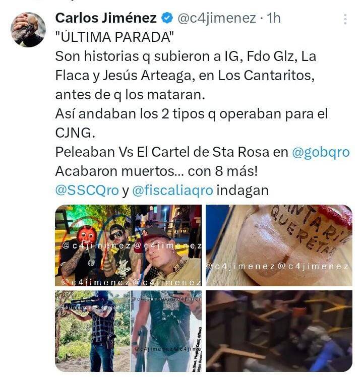 Carlos Jiménez, reportero especializado en temas policiacos, informó en su cuenta de X, antes Twitter, que efectivamente, los atacantes iban por dos presuntos miembros del Cartel Jalisco Nueva Generación (CJNG) que estaban en Los Cantaritos, uno de ellos apodado La Flaca "¡y acabaron muertos...con 8 más!".