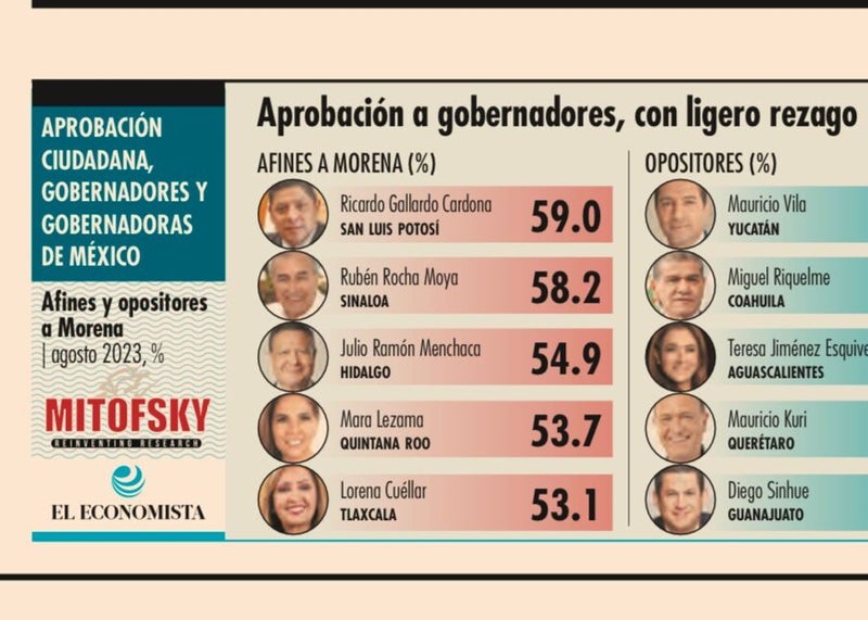 Para agosto del 2023, un total de 19 gobernadores tenían un nivel de aprobación alta (de 60 a 50%) entre los mandatarios se encuentra Mauricio Vila (Yucatán) con 61.9%, Ricardo Gallardo (SLP) con 59% y Miguel Riquelme (Coah) con 58.8 por ciento.