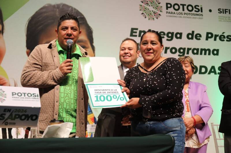 El gobernador Ricardo Gallardo Cardona realizó ayer la entrega de los créditos en el Teatro "Carlos Amador" del parque Tangamanga I, para que las beneficiarias establezcan negocios o refuercen sus proyectos y dijo en forma enfática que "en este Gobierno sí se apoya a las mujeres".