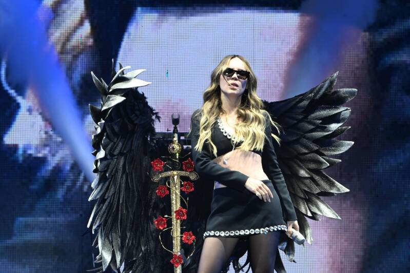 Ataviada con minifalda y top negros, lentes oscuros y unas imponentes alas, “La Beli” abrió con “Ángel”, para luego llevar la energía al máximo con “Lolita”, “Dopamina” y nuevos temas que hicieron vibrar a miles de asistentes. Desde el primer acorde, la conexión con el público fue total, logrando que cada canción se convirtiera en un coro multitudinario.