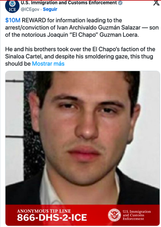 EL ICE OFRECE UNA NUEVA RECOMPENSA DE 10 MDD POR IVÁN ARCHIVALDO GUZMÁN LOERA, LÍDER DE LOS CHAPITOS
