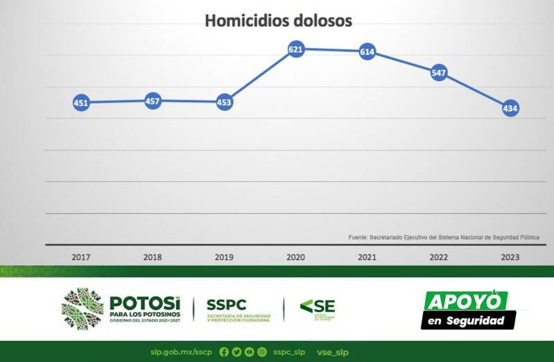 "San Luis Potosí está por debajo de la media a nivel nacional en incidencia delictiva y durante 2023 delitos de alto impacto como homicidio doloso, feminicidio, secuestro, robo a casa habitación y robo de vehículos de cuatro ruedas, alcanzaron la cifra más baja de los últimos seis años", reiteró.
