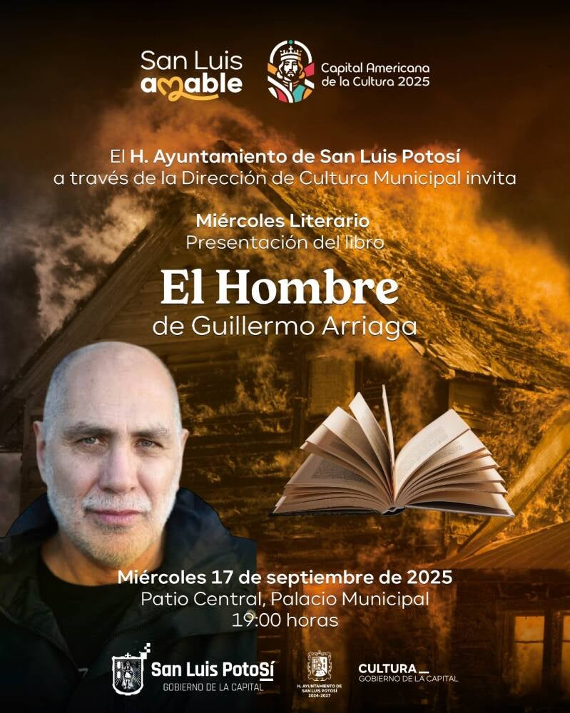 El Gobierno de la Capital en el marco de San Luis Potosí Capital Americana de la Cultura, trae este miércoles 17 de septiembre, a las 19 horas, al gran escritor, guionista y director de cine Guillermo Arriaga (Ciudad de México, 1958), quien presenta su nueva novela “El Hombre” (Alfaguara 2025), en el Centro Cultural Palacio Municipal.
