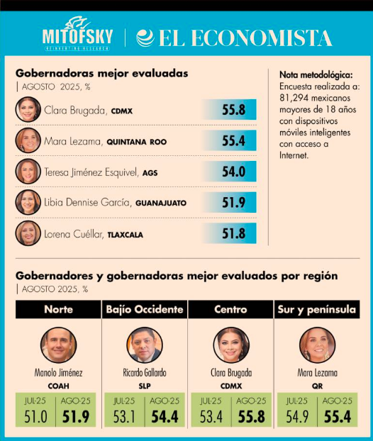 Las cifras del “Ranking Mitofsky Capítulo: gobernadores y gobernadoras de México sobre aprobación ciudadana”, medición mensual realizada para El Economista mostraron que Clara Brugada, jefa de gobierno de la Ciudad de México, encabezó la lista con 55.8% y Javier May, gobernador de Tabasco estuvo al final con 41 por ciento.