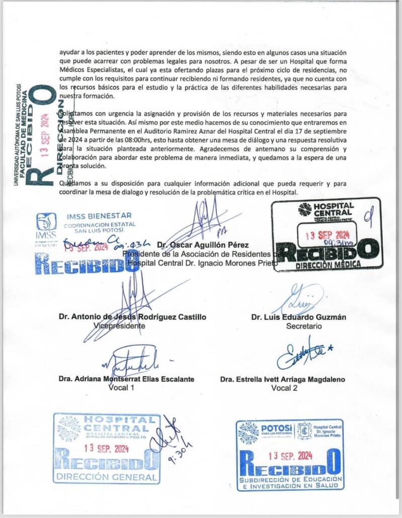 Ahora la acción de los médicos residentes surge como respuesta a la crisis hospitalaria que sufre el Hospital Central, misma que fue comunicada mediante una carta dirigida al gobernador Ricardo Gallardo Cardona, así como a las distintas las autoridades en materia de salud del estado y de la Universidad Autónoma de San Luis Potosí. La misiva fue firmada por el Dr. Óscar Aguillón Pérez, presidente de la Asociación de Residentes del Hospital Central, quien expuso la grave escasez de insumos básicos, medicamentos y materiales para diagnóstico, que está afectando la calidad del servicio y la seguridad de los pacientes.