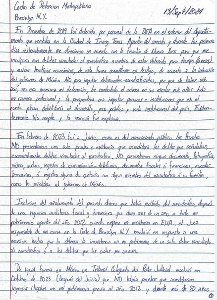 Asimismo, en la misiva escrita a mano, García Luna afirmó que en febrero del 2023 fue a juicio, pero la parte acusadora no presentó “una sola prueba o existencia que acreditará los delitos que señalaron. No presentaron ningún documento, fotografía, video, audio, registro de comunicación- telefónico, documentos fiscales o financieros, cuentas bancarias, ó resgistro alguno de contacto con algún miembro del narcotráfico o su familia”.
