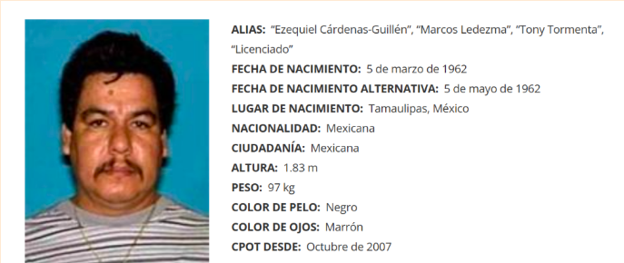 Antonio Ezequiel Cárdenas Guillén, conocido como "Tony Tormenta", nació en 1962 en Matamoros y fue uno de los líderes más visibles del Cártel del Golfo (CDG). Tras la captura de su hermano Osiel en 2003, asumió el control de la organización criminal, vinculada al tráfico de drogas, extorsiones, secuestros y trata de personas.
