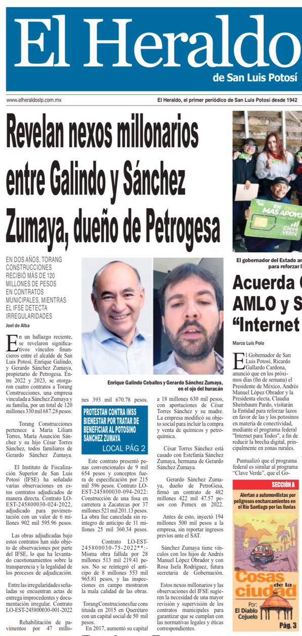 En el texto de la nota de este medio de comunicación nacional, propiedad del periodista Federico Arreola, señala que "recientemente se revelaron nexos millonarios entre alcalde de San Luis Potosí, Enrique Galindo, y el dueño de Petrogesa, Gerardo Sánchez Zumaya.