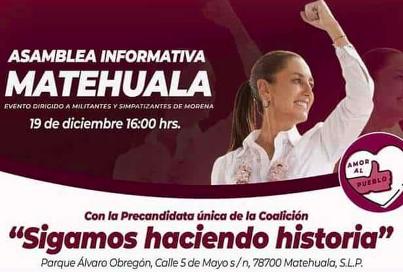 La precandidata presidencial Claudia Sheinbaum Pardo visita hoy nuevamente San Luis Potosí con motivo del Encuentro Nacional para el Cuidado del Agua que se desarrollará en el municipio de Matehuala, donde a las 4 pm sostendrá una reunión con distintos actores como productores, organismos operadores de agua y académicos para comenzar a buscar una solución al creciente problema del estrés hídrico y falta de agua, confirmó ayer en rueda de prensa Arturo Ramírez Cuellar.