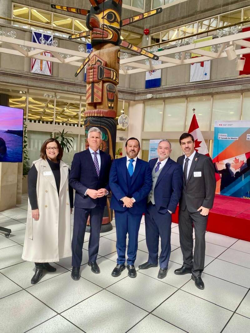 En representación del mandatario potosino, el secretario de Desarrollo Económico, Jesús Salvador González Martínez, abordó temas estratégicos como el aprovechamiento del T-MEC y la organización de una Misión Comercial de empresas canadienses interesadas en el potencial productivo potosino.
