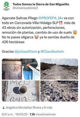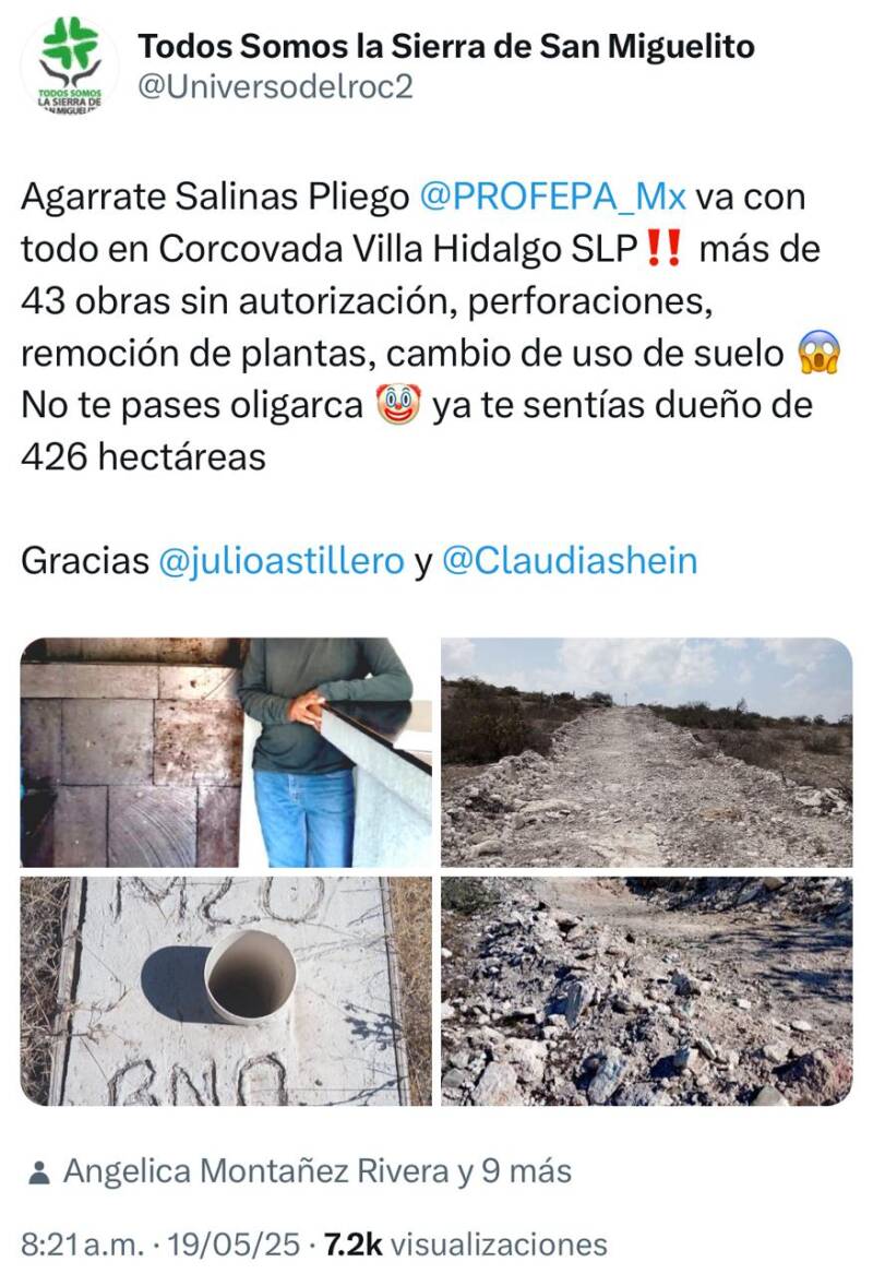 En estos momentos inspectores de la Procuraduría Federal del Medio Ambiente (PROFEPA), dependencia de la Secretaría del Medio Ambiente y Recursos Naturales (SEMARNAT) se encuentran en el ejido de Corcovada, municipio de Villa Hidalgo, en lo que se considera que es el final del proyecto extractivista de Salinas Pliego en dicha zona, ya que en esa área hay más de 43 obras sin autorización, perforaciones, remoción de plantas y cambio de uso de suelo sin autorización federal por lo que procede una clausura.