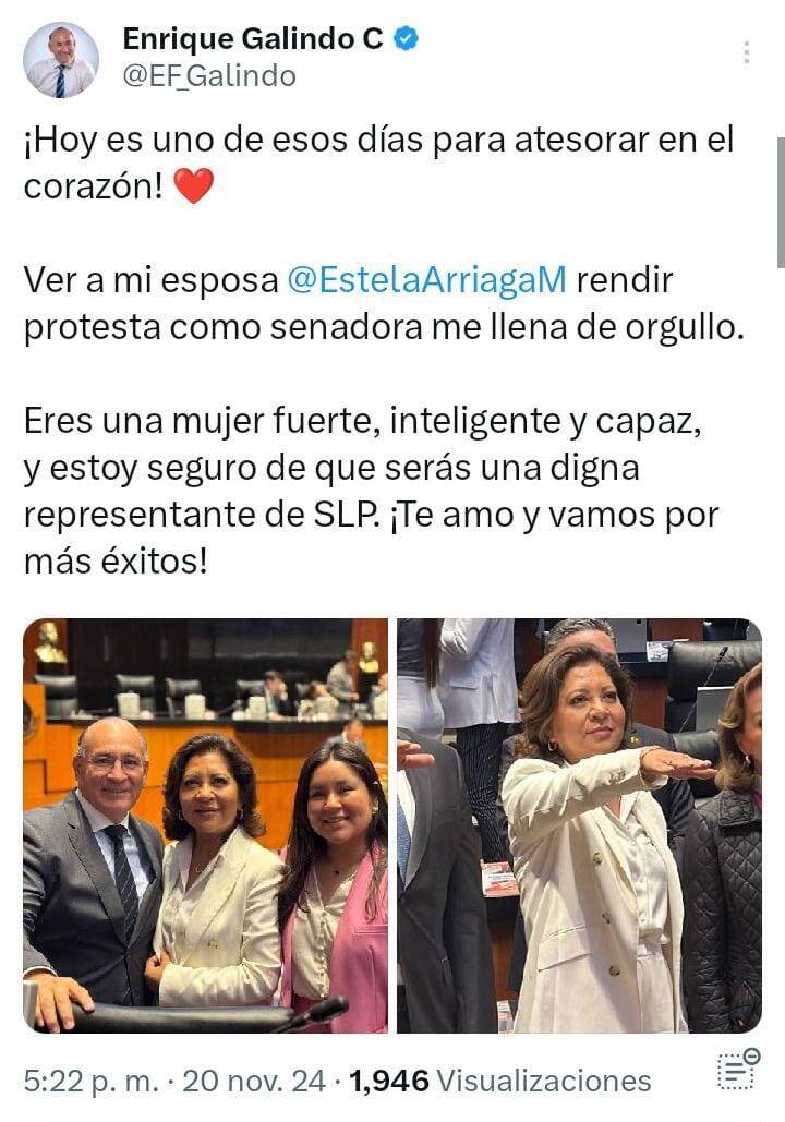 Ahora, la presidenta honoraria del DIF capitalino y esposa del alcalde Enrique Francisco Galindo Ceballos, forma parte de la LXVI Legislatura en el Congreso de la Unión. El edil notificó al Cabildo de la Capital acerca de su ausencia ayer en el municipio de San Luis Potosí y posteó el siguiente mensaje en sus redes sociales:
