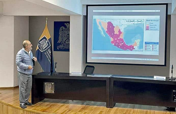 Pulso da cuenta que "en el marco de la 36 Semana de la Facultad de Ciencias de la Información, el académico de la Universidad Autónoma de San Luis Potosí expuso que la entidad potosina se encuentra con un riesgo alto sindémico, el cual se refiere a la concentración de dos o más epidemias o brotes de enfermedades en una población que interaccionan y son condicionadas por las circunstancias sociales, políticas y económicas durante un periodo y lugar determinado.