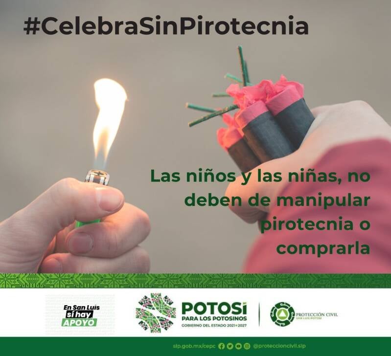 En este marco, el mandatario potosino instruyó a la Coordinación Estatal de Protección Civil (CEPC) arrancar la campaña en redes sociales “#CelebraSinPirotecnia”, con el objeto de evitar accidentes a consecuencia del mal uso y manejo de la pirotecnia por parte de la ciudadanía.
