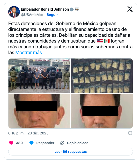 Tras darse a conocer las detenciones, el embajador de Estados Unidos en México, Ronald Johnson, destacó la relevancia de estas acciones en sus cuentas oficiales: