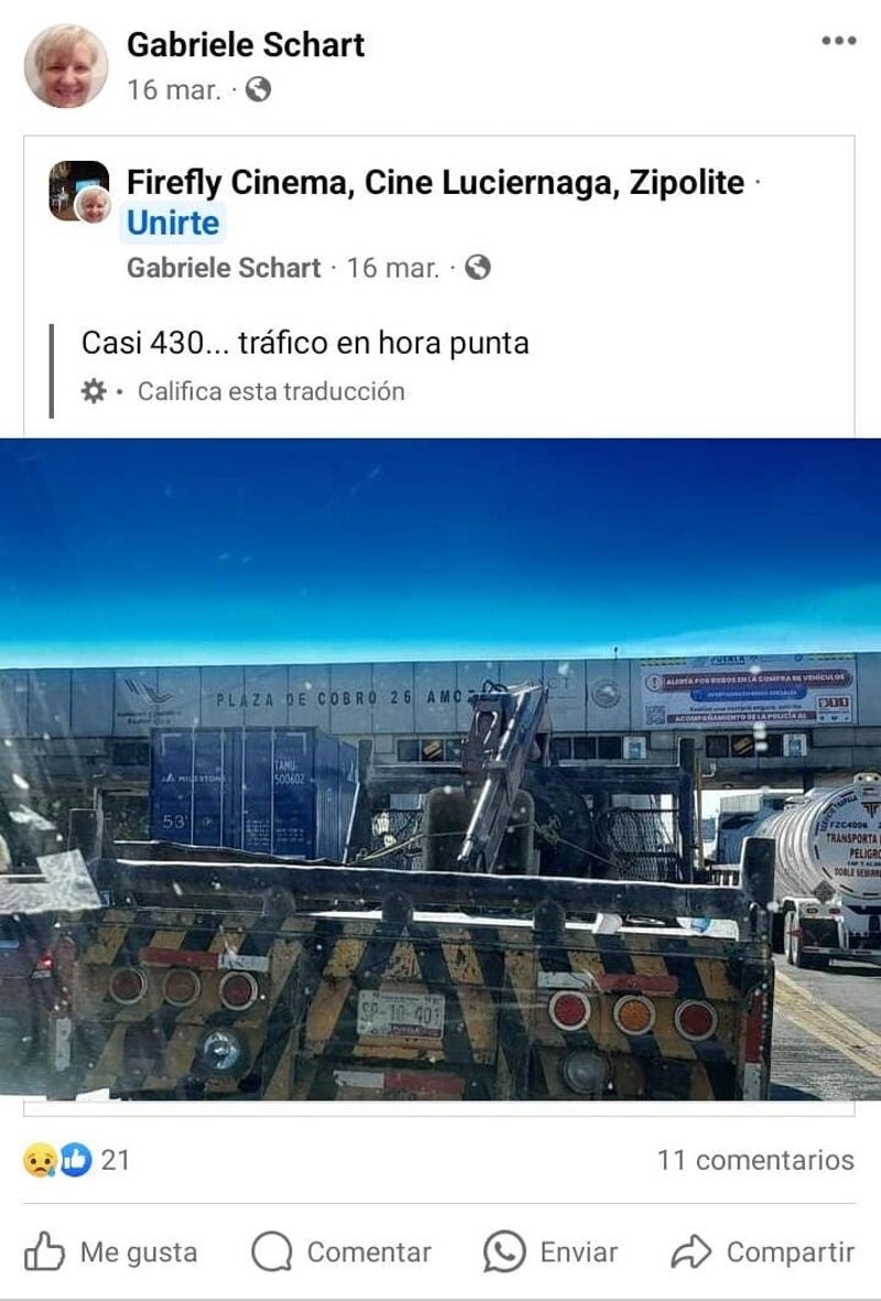 “Casi las 16:30 … hora pico”, compartió junto a una fotografía del tráfico que tenía por delante, siendo esa su última publicación.