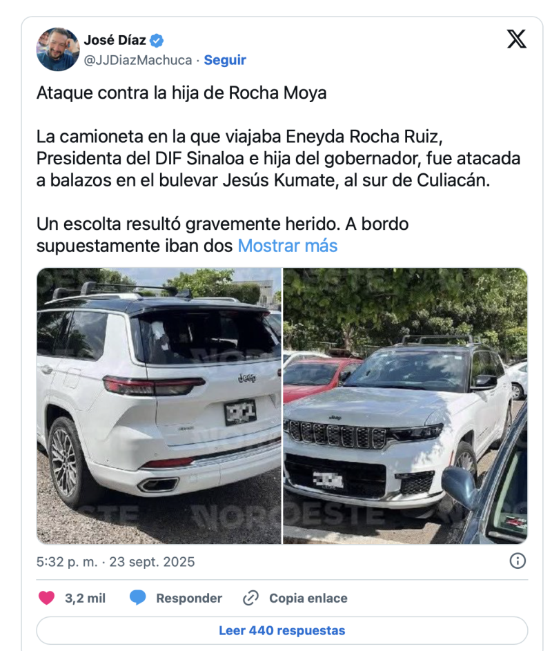 Rocha Moya confirmó el ataque a través de su cuenta de X y aseguró que su nieta se encuentra a salvo. La Secretaría de Seguridad Pública de Sinaloa había informado previamente sobre el ataque, sin revelar en ese momento la identidad de la persona protegida.
