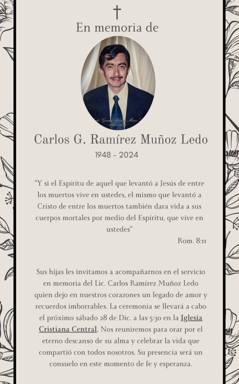 Murió ayer el Lic. Carlos G. Ramírez Muñoz Ledo a los 76 años de edad. Fue un destacado político potosino perteneciente al grupo Los Macabeos de Juan Ramiro Robledo Ruiz, término acuñado por el periodista Fidel Briano que trataba de explicar con ese término bíblico al conjunto de inquietos jóvenes universitarios que en época del gobernador Carlos Jonguitud Barrios -de quien fue su secretario particular- exigían espacios de participación en el PRI y en la administración pública.