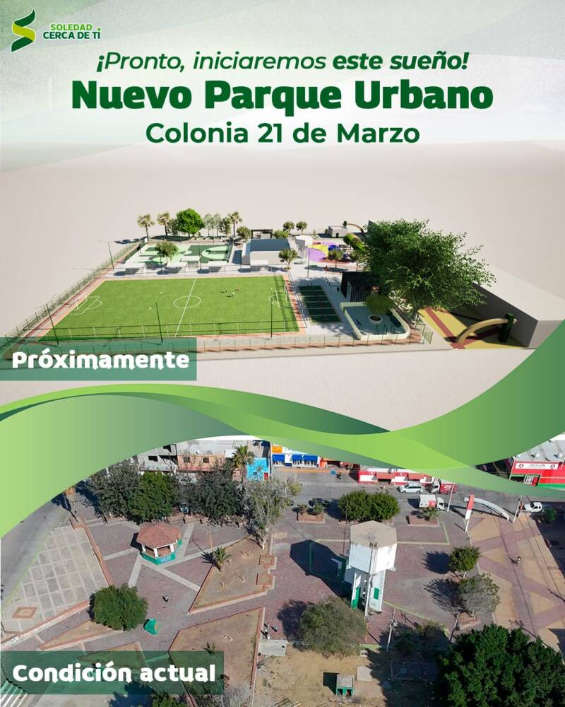 Juan Manuel Navarro Muñiz, presidente municipal de Soledad de Graciano Sánchez, confirmó que las familias de la colonia 21 de Marzo tendrán un nuevo espacio de recreación icónico y trascendental, un anhelo social que durante mucho tiempo no se había cristalizado: anunció la construcción de un Parque Urbano en la Plaza principal, la cual hoy luce en condiciones deplorables y dañadas. Este proyecto de infraestructura deportiva iniciará este martes 27 de enero.
