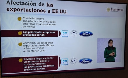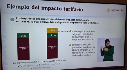 “O sea, es un tiro en el pie. Los impuestos, digo impuestos porque un arancel es un impuesto. Los impuestos propuestos, o sea, el 25% tendrían un impacto directo en las empresas, porque equivale a duplicar el impuesto sobre utilidades. ¿Cuál es el impuesto sobre las utilidades en Estados Unidos? Para Ford, General Motors, Stellantis y otras empresas. Imagínense todas las autopartes, ya no les puse toda la lista porque no me cabe aquí. Son millones de empleos en Estados Unidos. Entonces, pagan ahorita, esta es su estructura, el producto de este producto, el 21% lo pagan en utilidades, impuestos. De repente le pones 25, entonces el impacto sobre las empresas es enorme. Más o menos pensamos que al final estos impuestos van a afectar al consumidor en los Estados Unidos, pero también a las empresas y se perderían alrededor de 400 mil empleos”, finalizó.