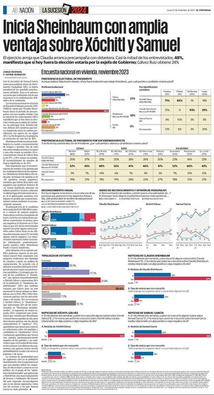 Claudia Sheinbaum con 24 puntos de ventaja sobre Xóchitl Gálvez; Samuel García empieza la carrera con 8: El Universal