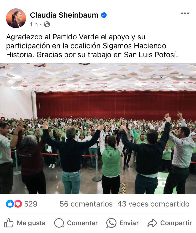 SHEINBAUM AFIRMÓ QUE EN ESTADOS COMO SLP MORENA VA POR SEPARADO CON EL PVEM Y PT PARA LOGRAR MÁS SENADURÍAS