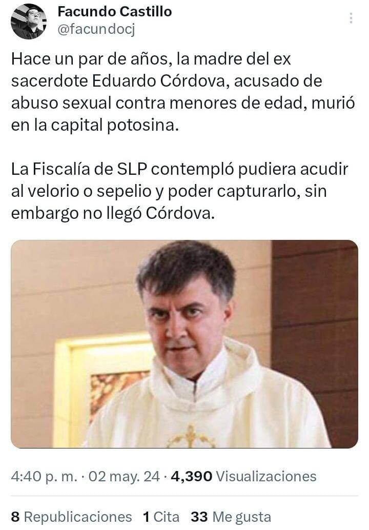 El pederasta es uno de los prófugos potosinos más buscados por autoridades nacionales e internacionales como Interpol. Es acusado de cometer más de cien abusos sexuales contra víctimas que dieron testimonio ante el Tribunal Eclesiástico de la Arquidiócesis de San Luis Potosí sobre los sucesos cometidos durante años. Por estos hechos, la otrora Procuraduría General del Estado emitió una orden de aprehensión contra Eduardo Córdova Bautista.