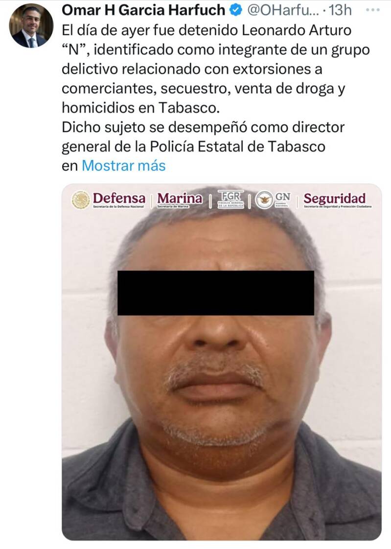 "El día de ayer fue detenido Leonardo Arturo ‘N’, identificado como integrante de un grupo delictivo relacionado con extorsiones a comerciantes, secuestro, venta de droga y homicidios en Tabasco. Dicho sujeto se desempeñó como director general de la Policía Estatal de Tabasco en el año 2021", informó Harfuch en redes sociales durante la mañana del jueves.