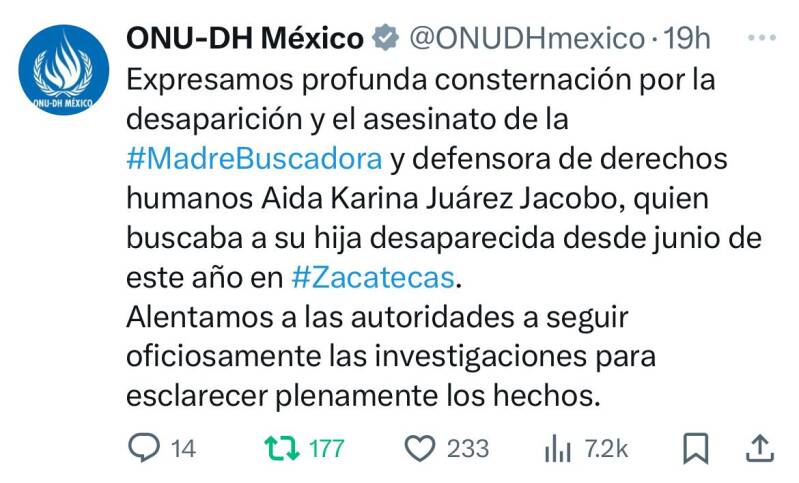 "Expresamos profunda consternación por la desaparición y el asesinato de la #MadreBuscadora y defensora de derechos humanos Aida Karina Juárez Jacobo, quien buscaba a su hija desaparecida desde junio de este año en #Zacatecas. Alentamos a las autoridades a seguir oficiosamente las investigaciones para esclarecer plenamente los hechos", dijo en su cuenta de X.