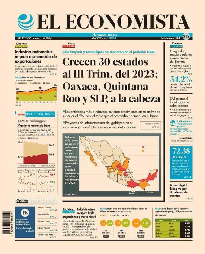 En su edición de ayer en su nota más importante o de 8 columnas en portada, el periódico El Economista dio a conocer que las economías de Oaxaca, Quintana Roo y San Luis Potosí registraron alzas superiores a 9%. Lo curioso es que Oaxaca (Corredor del Istmo de Tehuantepec) y Quintana Roo (Tren Maya) contaron con millonarias inversiones del gobirno federal que encabeza el presidente Andrés Manuel López Obrador y el crecimiento de SLP fue por su industria manufacturera: