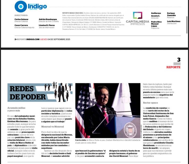 Por su parte, en la columna Redes de Poder de Reporte Índigo señala: "Rector opaco. La rendición de cuentas no es el fuerte del rector de la Universidad Autónoma de San Luis Potosí, Alejandro Zermeño Guerra. Como no tolera que le auditen el manejo de los recursos públicos que recibe de la Federación y del Gobierno del Estado, el gasto en viajes, viáticos, los elevados sueldos, pensiones y prestaciones de él mismo y sus principales colaboradores , por arriba de lo que gana la presidenta Claudia Sheinbaum, se encierra en su torre de marfil y se ampara para que sus excesos y privilegios no queden expuestos a la opinión pública".
