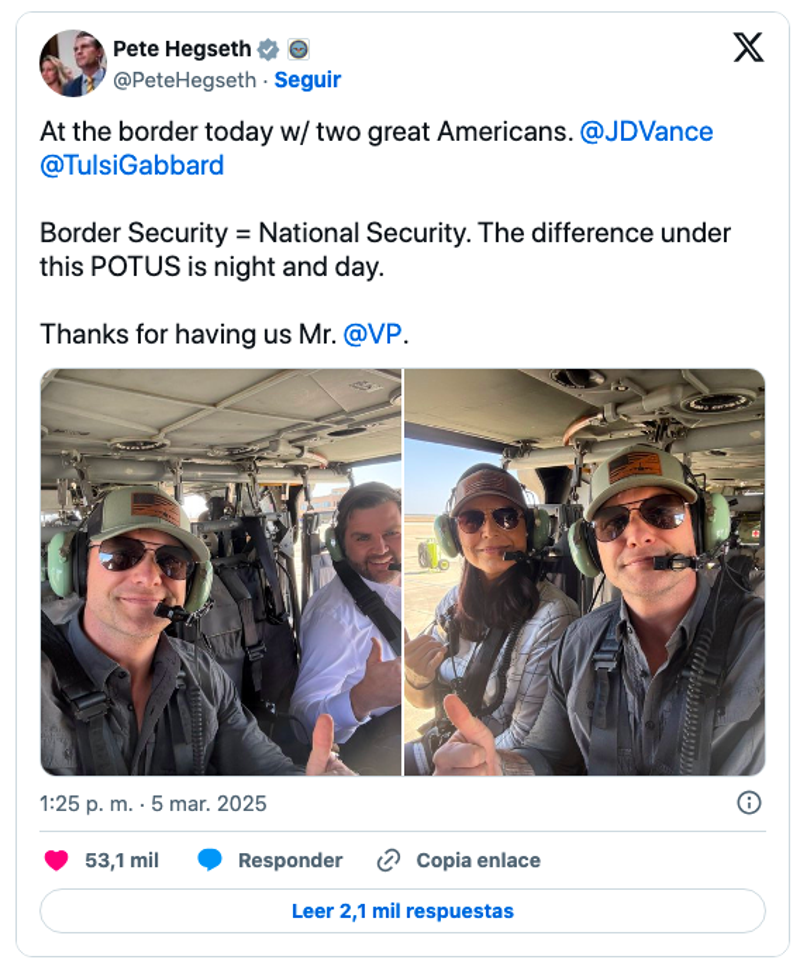 La presencia de Hegseth y Gabbard en la visita pone de manifiesto la forma en la que Trump está encargando a las agencias del gobierno federal trabajar para reformar la política fronteriza e inmigratoria, yendo mucho más allá del Departamento de Seguridad Nacional, el hogar tradicional de la mayoría de estas funciones.