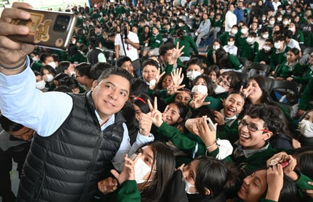Contento de convivir con estudiantes de la secundaria general "Graciano Sánchez Romo" que lo recibió con entusiasmo, el mandatario potosino anunció que más de 500 mil niñas, niños y jóvenes tendrán cobertura de gastos médicos mayores, siendo el primer estado del país en brindar este apoyo.