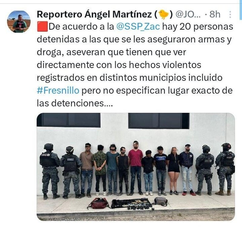 De acuerdo a la Secretaría de Seguridad Pública de Zacatecas hay 20 personas detenidas a las que se les aseguraron armas y droga. Aseveraron que tienen que ver directamente con los hechos violentos registrados en distintos municipios incluido Fresnillo pero no especificaron el lugar exacto de las detenciones.