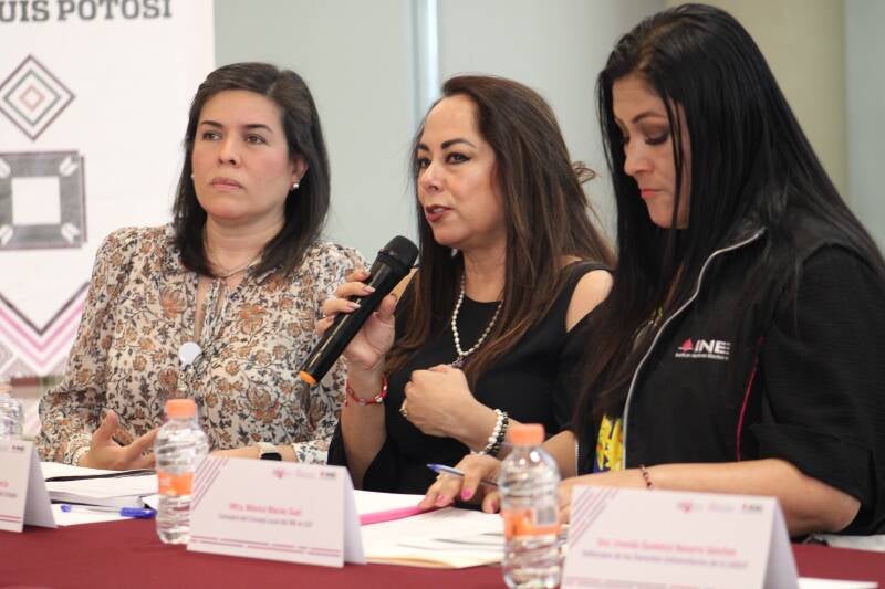 Mónica Macías Guel, Consejera del Consejo Local del INE en San Luis Potosí, fue la encargada de moderar este encuentro, quien junto a tres expertas en el tema analizaron el contexto de la arena política para las mujeres en San Luis Potosí, las medidas, leyes y normativas para las mujeres que han sido víctimas de violencia política en razón de género se empoderen y así garantizar su plena participación en el Proceso Electoral 2024.