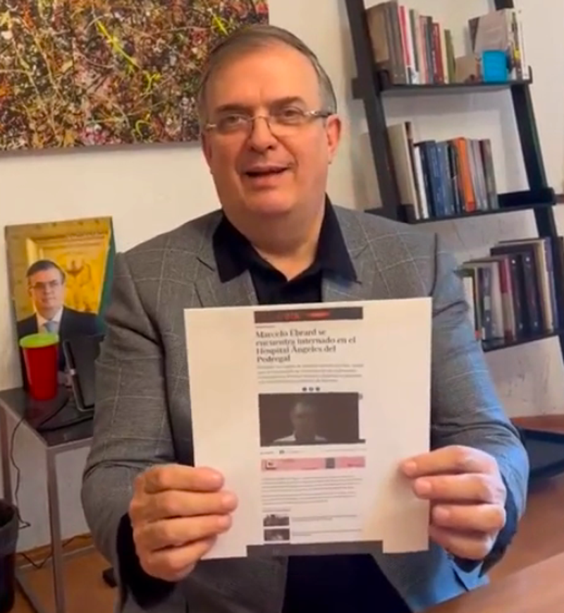 El excanciller, que no ha superado que Claudia Sheinbaum le haya ganado la partida para ser el coordinador de los Comités de Defensa de la 4T y cuyos colaboradores han amagado con irse a Movimiento Ciudadano (MC) de su amigo Danrte Delgado, apareció sosteniendo una hoja con la impresión de la versión que circuló en redes sociales sobre su estado de salud.