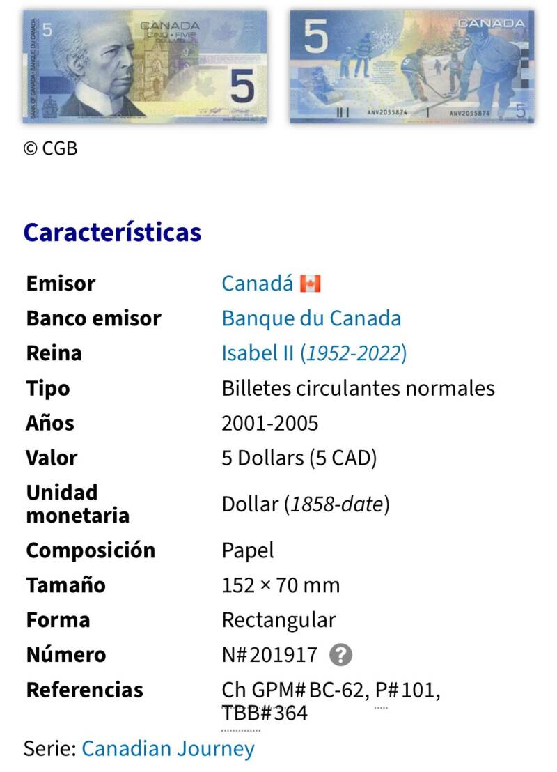 Textos en inglés y francés. En el lado izquierdo, el instituto emisor y el escudo de armas de Canadá. El retrato es el de Sir Henry Charles Wilfrid Laurier, estadista, séptimo Primer Ministro de Canadá de 1896 a 1911 y primer francófono en ocupar este cargo. En el centro hay una vista frontal del Bloque Oeste de los Edificios del Parlamento en Ottawa con una leyenda a su derecha. Debajo de la leyenda figura el valor facial del billete, "5", y encima, una bandera canadiense. La impresión multicolor está dominada por el azul/amarillo.