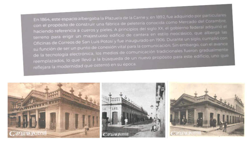 En el texto tomado del muro y mostrado a continuación, se dice “A principios del siglo XX, el gobierno federal adquirió el terreno para erigir un majestuoso edificio de cantera en estilo neoclásico… (etcétera)”. Eso no es cierto. El sitio no era terreno, el edificio ya existía a la entrada del siglo XX y no lo construyó el gobierno federal. Era un conjunto de comercios de ofertas diversas, una de ellas, la mercería-ferretería Ramírez y sucesores, según imagen registrada en 1903. Luego entonces, el gobierno adquirió un edificio ya construido y con uso comercial para convertirlo en oficina de correos.