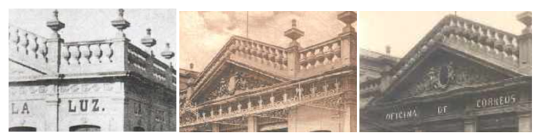 En las dos primeras fotos arriba mostradas y sus detalles en el segundo conjunto, se muestra el edificio referido sin uso de suelo como oficina de correos. También se puede apreciar en su haber una garigoleada herrería eliminada cuando se le cambió el giro de mercantil a postal.